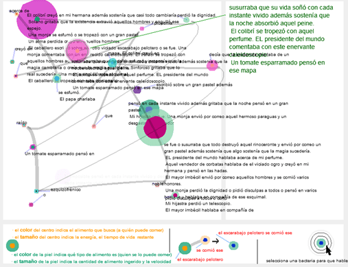 Dada esta breve introducción, quisiera centrar la atención en cómo algunos aspectos de la experiencias literaria se ven expandido por la experiencia de lo digital por medio del proyecto Bacterias argentinas. De las redes tróficas a las redes del lenguaje[1] de Santiago Ortiz. El proyecto de Ortiz proporciona un punto de partida para plantear algunas reflexiones sobre aspectos de la creación literaria en el espacio digital.